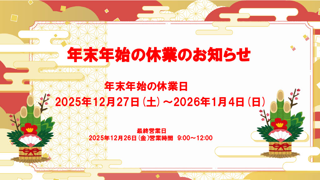 年末年始は下記の日程で休業いたします。2025年12月27日(土) ~ 2026年1月4日(日) 年内最終営業日2025年12月26日(金) スタジオ予約受付、レンタル部 12:00まで 年始営業日2026年1月5日(...